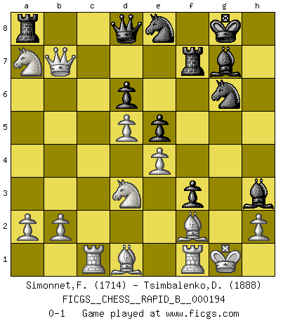 Last move : 0-1 2012 May 15 23:20:7 [Event "FICGS__CHESS__RAPID_B__000194"] [Site "FICGS"] [Date "2012.03.13"] [Round "1"] [White "Simonnet,Franck"] [Black "Tsimbalenko,Dmitry"] [Result "0-1"] [WhiteElo "1714"] [BlackElo "1888"] 1.d4 Nf6 2.c4 g6 3.Nc3 Bg7 4.e4 d6 5.Nf3 O-O 6.Be2 e5 7.O-O Nc6 8.d5 Ne7 9.Ne1 Nd7 10.Nd3 f5 11.Bd2 Nf6 12.f3 f4 13.c5 g5 14.cxd6 cxd6 15.Rc1 Ng6 16.Be1 Rf7 17.Bf2 h5 18.Qb3 g4 19.Nb5 Ne8 20.fxg4 hxg4 21.Nxa7 Bd7 22.Qxb7 f3 23.gxf3 gxf3 24.Bd1 Bh3 0-1 King's Indian : Orthodox, Aronin-Taimanov variation (Yugoslav attack / Mar del Plata variation) Kingside Castling by player Black (move 5) Kingside Castling by player White (move 7) Player Black won this chess game. Follow this game move after move (download)A good sacrifice is one that is not necessarily sound but leaves your opponent dazed and confused. (Rudolph Spielmann) Bis jetzt ist Weiß einer wohlbekannten Analyse gefolgt. Aber jetzt begeht er einen schrecklichen Fehler: Er beginnt seinen eigenen Kopf zu benutzen. (Siegbert Tarrasch) El Ajedrez es el arte del análisis. (Mikhail Botvinnik) Les échecs sont utiles à l'exercice de la faculté de penser et à celle de l'imagination. Car nous devons posséder une méthode élaborée pour atteindre des buts partout où nous devons conduire notre raison. (Leibnitz) Lottery : A tax on people who are bad at math. (Author unknown)