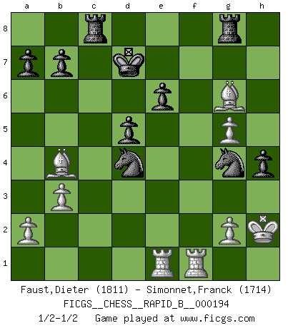 Last move : 1/2-1/2 2012 August 13 15:25:31 [Event "FICGS__CHESS__RAPID_B__000194"] [Site "FICGS"] [Date "2012.03.13"] [Round "1"] [White "Faust,Dieter"] [Black "Simonnet,Franck"] [Result "1/2-1/2"] [WhiteElo "1811"] [BlackElo "1714"] 1.e4 c6 2.Nf3 d5 3.e5 Bg4 4.h3 Bxf3 5.Qxf3 e6 6.d4 Nd7 7.Bd3 c5 8.c3 Qb6 9.Qf4 cxd4 10.cxd4 Ne7 11.Nd2 Nc6 12.Nf3 Bb4+ 13.Kf1 Be7 14.Qg4 g5 15.b3 h5 16.Qg3 Nb4 17.Bb1 Rc8 18.Bd2 Qb5+ 19.Kg1 Qe2 20.Kh2 h4 21.Qg4 f5 22.exf6 Bd6+ 23.Ne5 Qxg4 24.Bg6+ Kd8 25.hxg4 Nc2 26.Rae1 Nxd4 27.f4 Nxf6 28.Nf7+ Kd7 29.Rhf1 Rhg8 30.Nxd6 Kxd6 31.Bb4+ Kd7 32.fxg5 Nxg4+ 1/2-1/2 Caro-Kann defense This chess game ended in a draw. Follow this game move after move (download)Chess is a foolish expedient for making idle people believe they are doing something very clever when they are only wasting their time. (George Bernard Shaw) Du musst Deinen Gegner in einen tiefen dunklen Wald führen wo 2+2=5 ist und wo der Weg, der wieder hinausführt, nur breit genug für einen ist. (Mikhail Nekhemyevich Tal) Con el fin de mejorar tu juego, debes de estudiar los finales antes que todo, ya que mientras que los finales pueden ser estudiados y dominados por sí mismos, el juegomedio y la apertura deben de ser estudiados en relación con los finales. (José Raúl Capablanca) On est toujours la mazette de quelqu'un d'autre. (Anonyme) No, no, you're not thinking; you're just being logical. (Niels Bohr)