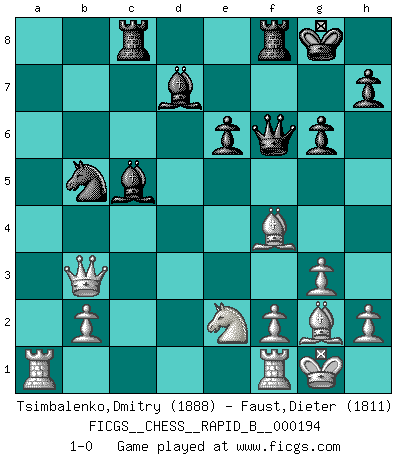 Last move : 1-0 2012 May 13 13:11:24 [Event "FICGS__CHESS__RAPID_B__000194"] [Site "FICGS"] [Date "2012.03.13"] [Round "1"] [White "Tsimbalenko,Dmitry"] [Black "Faust,Dieter"] [Result "1-0"] [WhiteElo "1888"] [BlackElo "1811"] 1.d4 d5 2.c4 c6 3.Nc3 Nf6 4.Nf3 dxc4 5.a4 Bf5 6.Ne5 Nbd7 7.Nxc4 Nb6 8.Ne5 a5 9.g3 Nfd7 10.Nxd7 Bxd7 11.e4 g6 12.Be3 Bg7 13.Qb3 O-O 14.Bg2 Nc8 15.d5 cxd5 16.Nxd5 e6 17.Nf4 Nd6 18.O-O Rc8 19.Bb6 Qe8 20.Bxa5 b5 21.axb5 Nxb5 22.Ne2 Bd4 23.Bb4 Bc5 24.e5 Qe7 25.Bd2 f6 26.exf6 Qxf6 27.Bf4 1-0 QGD Slav defense Kingside Castling by player Black (move 13) Kingside Castling by player White (move 18) Player White won this chess game. Follow this game move after move (download)The enormous mental resilience, without which no Chess player can exist, was so much taken up by Chess that he could never free his mind of this game. (Albert Einstein) Ein Gewinn durch eine ungenaue Kombination, sei sie auch noch so vorzeigbar, erfüllt mich mit Schaudern. (Wilhelm Steinitz) No solamente yo pronostico su triunfo sobre Botvinnik, sino que me adelanto y digo que probablemente Fischer es el jugador de Ajedrez mas grande que haya existido. (John Collins) Celui qui prend des risques peut perdre, celui qui n'en prend pas perd toujours. (Xavier Tartacover) However beautiful the strategy, you should occasionally look at the results. (Winston Churchill)
