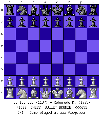 Last move : 0-1 2012 March 14 8:37:19 [Event "FICGS__CHESS__BULLET_BRONZE__000692"] [Site "FICGS"] [Date "2012.03.13"] [Round "1"] [White "Loridon,Geoffroy"] [Black "Reboredo,Daniel"] [Result "0-1"] [WhiteElo "1187"] [BlackElo "1779"] 0-1 This chess game has been lost on time (started : 2012.03.13 21:41:8) Player Black won this chess game. Follow this game move after move (download)Nonsense was the last thing Fischer was interested in, as far as Chess was concerned. (Elie Agur) Alles was am Schachbrett zählt sind gute Züge. (Robert James Fischer) Es muy difícil jugar en contra de la teoría de Einstein. - en su primera derrota en contra de Fischer (Mikhail Tal) C'est la seule position que je connaisse où les deux camps sont mals. Propos prêtés à V. Anand. I would love to change the world, but they won't give me the source code. (Unknown)