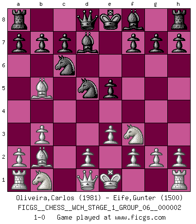 Last move : 1-0 2007 March 2 6:14:12 [Event "FICGS__CHESS__WCH_STAGE_1_GROUP_06__000002"] [Site "FICGS"] [Date "2007.01.16"] [Round "1"] [White "Oliveira,Carlos"] [Black "Eife,Gunter"] [Result "1-0"] [WhiteElo "1981"] [BlackElo "1500"] 1.b3 e5 2.Bb2 Nc6 3.e3 Nf6 4.c4 d5 5.cxd5 Nxd5 6.Bb5 Bd7 7.Nf3 1-0 This chess game has been lost on time (started : 2007.01.16 15:17:11) Nimzovich-Larsen attack : Modern variation Player White won this chess game. Follow this game move after move (download)All I want to do, ever, is just play Chess. (Bobby Fischer) Kritik überlasse ich den Spießern. Ich zeige nichts, wofür ich mich schämen muss. (Alexandra Kosteniuk) Alguna parte de un error es siempre correcto. (Savielly Tartakover) En blitz, le Cavalier l'emporte sur le Fou. (Vlastimil Hort) For peace of mind, resign as general manager of the universe. (Douglas Adams)