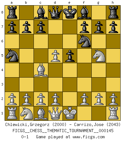 Last move : 0-1 2012 April 29 0:18:39 [Event "FICGS__CHESS__THEMATIC_TOURNAMENT__000145"] [Site "FICGS"] [Date "2012.03.15"] [Round "1"] [White "Chlewicki,Grzegorz"] [Black "Carrizo,Jose"] [Result "0-1"] [WhiteElo "2000"] [BlackElo "2043"] 1.e4 e5 2.Nf3 Nc6 3.Bc4 Nf6 4.Ng5 d5 5.exd5 Na5 0-1 This chess game has been lost on time (started : 2012.03.15 19:54:37) Two knights defense Player Black won this chess game. Follow this game move after move (download)My style is somewhere between that of Tal and Petrosian. (Reshevsky) Ein Teil des Fehlers ist immer korrekt. (Savielly Grigorievitsch Tartakower) Yo no creo en la psicología. Yo creo en las buenas movidas. (Bobby Fischer) La victoire dans une partie d'Echecs appartient la plupart du temps à celui qui voit un peu plus loin que l'adversaire. (Lasker) Always two there are. No more no less. A master, and an apprentice. (Master Yoda in Star Wars ep.1)