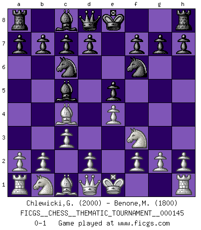 Last move : 0-1 2012 May 21 1:51:22 [Event "FICGS__CHESS__THEMATIC_TOURNAMENT__000145"] [Site "FICGS"] [Date "2012.03.15"] [Round "1"] [White "Chlewicki,Grzegorz"] [Black "Benone,Mateia"] [Result "0-1"] [WhiteElo "2000"] [BlackElo "1800"] 1.e4 e5 2.Nf3 Nc6 3.Bc4 Bc5 4.c3 Nf6 0-1 This chess game has been lost on time (started : 2012.03.15 19:54:37) Giuoco Piano Player Black won this chess game. Follow this game move after move (download)I give 98 percent of my mental energy to Chess. Others give only 2 percent. (Bobby Fischer) Wenn sie aufgeben, dann danke ich Ihnen für das Spiel (Eventualzug beim Fernschach). (Anonymous) Diferente gente reacciona diferentemente en aceptar la derrota. (Bobby Fischer) Les erreurs sont comme les malheurs, elles n'arrivent jamais seules. (Siegbert Tarrasch) But they are useless. They can only give you answers. (Pablo Picasso, about computers)