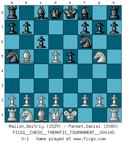 Last move : 0-1 2012 April 26 0:14:7 [Event "FICGS__CHESS__THEMATIC_TOURNAMENT__000145"] [Site "FICGS"] [Date "2012.03.15"] [Round "1"] [White "Malish,Dmitriy"] [Black "Parmet,Daniel"] [Result "0-1"] [WhiteElo "1539"] [BlackElo "2080"] 1.e4 e5 2.Nf3 Nc6 3.Bc4 Nf6 4.Ng5 d5 5.exd5 Na5 6.Bb5+ c6 0-1 This chess game has been lost on time (started : 2012.03.15 19:54:37) Two knights defense Player Black won this chess game. Follow this game move after move (download)In Chess, just as in life, today's bliss may be tomorrow's poison. (Assaic) Mit sehr nachdenklichem Gesicht schreitet Bobby durch den Turniersaal. Was ist passiert?, fragt Lombardy. Ich stehe schlecht, antwortet Fischer. Lombardy: Dann biete doch einfach Remis an. Fischer: So schlecht stehe ich nun auch wieder nicht! (Robert James Fischer) Tu sabes, camarada Pachman, no disfruto el ser un Ministro, preferería jugar al Ajedrez como tu. (Che Guevara) Lorsque vous vous retrouvez devant une position atroce, ne tendez pas un ultime piège dérisoire avec l'intention d'abandonner si l'adversaire le déjoue ! Faites-vous plutôt un devoir de résister comme si votre vie en dépendait. Jouez le coup qui vous déplairait au centuple si vous étiez dans la peau de votre tortionnaire ! I've never seen so many men wasted so badly. (Blondie in The Good, The Bad and The Ugly)