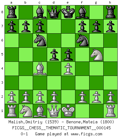 Last move : 0-1 2012 May 20 13:52:1 [Event "FICGS__CHESS__THEMATIC_TOURNAMENT__000145"] [Site "FICGS"] [Date "2012.03.15"] [Round "1"] [White "Malish,Dmitriy"] [Black "Benone,Mateia"] [Result "0-1"] [WhiteElo "1539"] [BlackElo "1800"] 1.e4 e5 2.Nf3 Nc6 3.Bc4 Nf6 4.Ng5 d5 0-1 This chess game has been lost on time (started : 2012.03.15 19:54:37) Two knights defense Player Black won this chess game. Follow this game move after move (download)A sacrifice is best refuted by accepting it. (Wilhelm Steinitz) Ich kenne keine einzige Person, die behaupten würde, Garri Kasparow sei ein guter Mensch (Nigel Short) Hay jugadores fuertes y personas amables y yo soy un jugador fuerte. (Bobby Fischer) Il vaut toujours mieux jouer un plan faux de façon logique que de n'avoir pas de plan du tout. (Victor Kortchnoï) If I had no sense of humor, I would long ago have committed suicide. (Mahatma Gandhi)