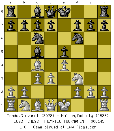 Last move : 1-0 2012 April 30 12:36:57 [Event "FICGS__CHESS__THEMATIC_TOURNAMENT__000145"] [Site "FICGS"] [Date "2012.03.15"] [Round "1"] [White "Tanda,Giovanni"] [Black "Malish,Dmitriy"] [Result "1-0"] [WhiteElo "2028"] [BlackElo "1539"] 1.e4 e5 2.Nf3 Nc6 3.Bc4 Bc5 4.c3 Nf6 5.d3 1-0 This chess game has been lost on time (started : 2012.03.15 19:54:37) Giuoco Piano Player White won this chess game. Follow this game move after move (download)When in doubt... play Chess ! (Tevis) Schach wird sich dank seiner hohen kulturellen Tradition immer durchsetzen. In näherer Zukunft womöglich sogar als Gegenreaktion auf die maßlose Reizüberflutung im Freizeit- und Spielbereich. (Garry Kasparov) Tu puedes aprender mucho mas de una partida que pierdas que de una partida ganada. Tendras que perder cientos de partidas antes de llegar a ser un buen jugador. (Jose Raul Capablanca) Vouloir jouer aux échecs contre soi-même est aussi paradoxal que vouloir marcher sur son ombre. (Stefan Zweig) It's not the size of the dog in the fight, it's the size of the fight in the dog. (Mark Twain)
