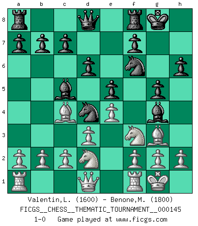 Last move : 1-0 2012 August 21 13:48:40 [Event "FICGS__CHESS__THEMATIC_TOURNAMENT__000145"] [Site "FICGS"] [Date "2012.03.15"] [Round "1"] [White "Valentin,Laurentiu"] [Black "Benone,Mateia"] [Result "1-0"] [WhiteElo "1600"] [BlackElo "1800"] 1.e4 e5 2.Nf3 Nc6 3.Bc4 Bc5 4.O-O Nf6 5.d3 O-O 6.Nc3 d6 7.Bg5 h6 8.Bh4 g5 9.Bg3 Bg4 10.Nb1 Nd4 11.Nbd2 1-0 This chess game has been lost on time (started : 2012.03.15 19:54:37) Giuoco Piano Kingside Castling by player White (move 4) Kingside Castling by player Black (move 5) Player White won this chess game. Follow this game move after move (download)The way he plays Chess demonstrates a man's whole nature. (Stanley Ellin) Ich verachte die Medien. (Robert James Fischer) En manos de Fischer's, una diminuta ventaja teórica es tan buena como tener una Reina de ventaja. (Isaac Kashdan) Vous savez, camarade Pachman, je n'éprouve pas de plaisir à être ministre, je jouerais plutôt aux échecs comme vous, ou alors ferais une révolution au Venezuela. (Che Guevara à Ludek Pachman, 'Checkmate in Prague', 1975) All art requires courage. (Anne Tucker)