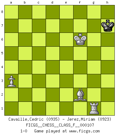 Last move : 1-0 2012 September 6 2:33:43 [Event "FICGS__CHESS__CLASS_F__000107"] [Site "FICGS"] [Date "2012.03.15"] [Round "1"] [White "Cavaille,Cedric"] [Black "Jerez,Miriam"] [Result "1-0"] [WhiteElo "0935"] [BlackElo "0923"] 1.e4 e5 2.Nf3 Nc6 3.Bc4 d5 4.exd5 Na5 5.Nxe5 Nxc4 6.Nxc4 Qxd5 7.Ne3 Qe6 8.Nc3 Bc5 9.O-O Nf6 10.Qe1 O-O 11.a3 a6 12.b4 Bxe3 13.Qxe3 Qxe3 14.dxe3 h6 15.e4 Re8 16.f3 Bd7 17.Nd5 Nxd5 18.exd5 Bb5 19.Rd1 Re2 20.Kf1 Rxc2 21.Kg1 Rf2 22.Kxf2 Rd8 23.Bf4 Rd7 24.Rac1 Ba4 25.Rd2 g5 26.Be3 Kg7 27.Rd3 Bb5 28.Rdc3 Kg6 29.Rxc7 Rxd5 30.Rxb7 f6 31.g4 h5 32.gxh5+ Kxh5 33.Kg3 f5 34.Rc5 Rxc5 35.Bxc5 f4 36.Kg2 Bc6 37.Rb6 Bd5 38.Rxa6 g4 39.b5 gxf3+ 40.Kf2 Kg4 41.b6 Kh3 42.Ra7 Kxh2 43.b7 Bxb7 44.Rxb7 Kh3 45.Kxf3 Kh4 46.Rg7 Kh5 47.Kxf4 Kh6 48.Rg1 Kh5 49.Bf2 Kh6 50.Kf5 Kh7 51.Kf6 1-0 King's pawn game Kingside Castling by player White (move 9) Kingside Castling by player Black (move 10) 10 pieces endgame at move 39 : White KRBPPP , Black KBPP WHITE : King + 1 Rook 1 Bishop 3 Pawns BLACK : King + 1 Bishop 2 Pawns 9 pieces endgame at move 42 : White KRBPP , Black KBPP WHITE : King + 1 Rook 1 Bishop 2 Pawns BLACK : King + 1 Bishop 2 Pawns 8 pieces endgame at move 43 : White KRBP , Black KBPP WHITE : King + 1 Rook 1 Bishop 1 Pawn BLACK : King + 1 Bishop 2 Pawns 7 pieces endgame at move 44 : White KRBP , Black KPP WHITE : King + 1 Rook 1 Bishop 1 Pawn BLACK : King + 2 Pawns 6 pieces endgame at move 45 : White KRBP , Black KP WHITE : King + 1 Rook 1 Bishop 1 Pawn BLACK : King + 1 Pawn 5 pieces endgame at move 47 : White KRBP , Black K WHITE : King + 1 Rook 1 Bishop 1 Pawn BLACK : King + Player White won this chess game. Follow this game move after move (download)You cannot play at Chess if you are kind-hearted. (French Proverb) Darum geht es im Schach. Einen Tag gibst du deinem Gegner eine Lektion, am nächsten Tag gibt er dir eine. (Robert James Fischer) Fischer sacrificó virtualmente todo lo que la mayoría de nosotros los 'debiles' (término que él usa) valoramos, respetamos y apreciamos por el amor de un astuto, a menudo hermoso tablero de juego, por el privilegio ambivalente de ser su mas grande maestro. (Paul Kollar) Que feriez-vous si vous étiez en train de jouer aux échecs et que la fin du monde arrive ? Je continuerais à jouer. (Saint Borromée) Begin at the beginning and go on till you come to the end; then stop. (Lewis Carrol, Alice in Wonderland)