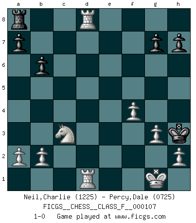 Last move : 1-0 2012 May 7 20:19:13 [Event "FICGS__CHESS__CLASS_F__000107"] [Site "FICGS"] [Date "2012.03.15"] [Round "1"] [White "Neil,Charlie"] [Black "Percy,Dale"] [Result "1-0"] [WhiteElo "1225"] [BlackElo "0725"] 1.d4 e6 2.c4 Nc6 3.Nf3 f6 4.g3 Nge7 5.Bg2 e5 6.dxe5 fxe5 7.Nc3 Ng6 8.Qd3 Bb4 9.O-O Qe7 10.Bg5 e4 11.Nxe4 Qe5 12.Nxe5 Ngxe5 13.Qd5 Kf8 14.f4 Ne7 15.Qxe5 Kf7 16.Qxe7+ Bxe7 17.Bxe7 Kxe7 18.Rad1 d6 19.c5 b6 20.cxd6+ cxd6 21.Nxd6 Ba6 22.Bxa8 Bxe2 23.Rfe1 Rxa8 24.Rxe2+ Kf6 25.Nb5 Kf5 26.Nd6+ Kg4 27.Ne4 Kf3 28.Nc3 Kg4 29.Red2 Kh3 30.Rd8 1-0 Queen's pawn Kingside Castling by player White (move 9) Player White won this chess game. Follow this game move after move (download)Fischer is an American Chess tragedy on par with Morphy and Pillsbury. (Mig Greengard) Du musst nicht gut spielen, es reicht, wenn du besser spielst als dein Gegner. (Anonymous) Entre mas años cumplo, mas valoro los Peones. (Keres) Il a essayé de se convaincre qu'il pourrait empêcher toutes les erreurs et ne jamais perdre. L'horreur ! Gary Kasparov au sujet de Robert Fischer. A married woman is like a fish riding a bicycle. (Rodolfo d'Ettorre)