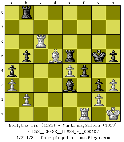 Last move : 1/2-1/2 2012 August 11 1:44:19 [Event "FICGS__CHESS__CLASS_F__000107"] [Site "FICGS"] [Date "2012.03.15"] [Round "1"] [White "Neil,Charlie"] [Black "Martinez,Silvio"] [Result "1/2-1/2"] [WhiteElo "1225"] [BlackElo "1029"] 1.e4 e5 2.Nf3 Nc6 3.Bb5 Nge7 4.c3 a6 5.Ba4 b5 6.Bb3 d5 7.Qe2 Bb7 8.O-O dxe4 9.Qxe4 Ng6 10.d4 Be7 11.Be3 O-O 12.Nbd2 Rb8 13.Qd3 exd4 14.cxd4 Nb4 15.Qe2 a5 16.Rfe1 a4 17.Bd1 h6 18.Nf1 Bf6 19.a3 Bxf3 20.Qxf3 Nh4 21.Qe2 Nd5 22.Ng3 Re8 23.Rc1 Nxe3 24.fxe3 Bxd4 25.Nf1 Bb6 26.Bc2 Qg5 27.Kh1 Nf5 28.Qd3 c6 29.Qxf5 Qxf5 30.Bxf5 g6 31.Bg4 f5 32.Bf3 g5 33.Bxc6 Re5 34.e4 f4 35.Nd2 h5 36.h3 g4 37.Bd5+ Kg7 38.Rf1 Be3 39.Rc7+ Kf6 40.Rf7+ Kg6 41.Rc7 Bxd2 42.Rc5 g3 43.Rc6+ Kg5 44.Rc2 Be3 45.Rc6 1/2-1/2 Ruy Lopez : Cozio defense Kingside Castling by player White (move 8) Kingside Castling by player Black (move 11) This chess game ended in a draw. Follow this game move after move (download)Chess is a foolish expedient for making idle people believe they are doing something very clever when they are only wasting their time. (George Bernard Shaw) Wer wird heute Abend ihr Gegner sein? -- Heute Abend spiele ich gegen die schwarzen Steine. (Akiba Rubinstein) El Ajedrez se juega con la mente... ¡no con las manos!. (Renaud y Kahn) Assurément je connaissais par expérience le mystérieux attrait de ce jeu royal, le seul entre tous les jeux inventés par les hommes qui échappe souverainement à la tyrannie du hasard, le seul où l'on ne doive sa victoire qu'à son intelligence ou plutôt à une certaine forme d'intelligence. Mais n'est-ce pas déjà le limiter injurieusement que d'appeler les échecs un jeu ? N'est-ce pas une science, un art ou quelque chose qui, comme le cercueil de Mahomet entre ciel et terre, est suspendu entre l'un et l'autre, et qui réunit un nombre incroyable de contraires ? [...] C'est une pensée qui ne mène à rien, une mathématique qui n'établit rien, un art qui ne laisse pas d'uvre, une architecture sans matière; et il l'a prouvé néanmoins qu'il était plus durable, à sa manière, que les livres ou que tout autre monument, ce jeu unique qui appartient à tous les peuples et à tous les temps, et dont personne ne sait quel dieu en fit don à la terre pour tuer l'ennui, pour aiguiser l'esprit et stimuler l'âme. Où commence-t-il, où finit-il ? (Stefan Zweig) The Internet is so big, so powerful and pointless that for some people it is a complete substitute for life. (Andrew Brown)