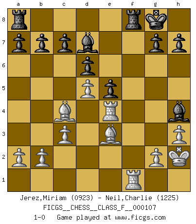 Last move : 1-0 2012 April 17 23:1:47 [Event "FICGS__CHESS__CLASS_F__000107"] [Site "FICGS"] [Date "2012.03.15"] [Round "1"] [White "Jerez,Miriam"] [Black "Neil,Charlie"] [Result "1-0"] [WhiteElo "0923"] [BlackElo "1225"] 1.e4 e5 2.Nf3 Nf6 3.Nc3 d6 4.Bc4 Nbd7 5.O-O Be7 6.d4 O-O 7.d5 Nc5 8.h3 Ncxe4 9.Nxe4 Nxe4 10.Re1 f5 11.c3 Bd7 12.Nd2 Bh4 13.Nxe4 fxe4 14.Rxe4 Bxf2+ 15.Kh2 Qf6 16.Be3 Bh4 17.Qf1 Qxf1 18.Rxf1 1-0 Petrov Three knights game Kingside Castling by player White (move 5) Kingside Castling by player Black (move 6) Player White won this chess game. Follow this game move after move (download)The blunders are all there on the board, waiting to be made. (Savielly Tartakover) Ein Teil des Fehlers ist immer korrekt. (Savielly Grigorievitsch Tartakower) La vida es como el Ajedrez, con lucha, competición y eventos buenos y malos. (Benjamin Franklin) Le profane ne songe pas à la somme de jouissance dont il se prive, qui méconnaît ce jeu aux ressources aussi variées que passionnantes. (Jean-Marie Jeanton-Lamarche) The ego is not master in its own house. (Sigmund Freud)