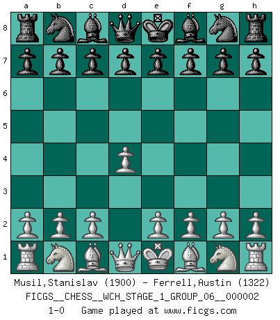 Last move : 1-0 2007 February 15 22:29:16 [Event "FICGS__CHESS__WCH_STAGE_1_GROUP_06__000002"] [Site "FICGS"] [Date "2007.01.16"] [Round "1"] [White "Musil,Stanislav"] [Black "Ferrell,Austin"] [Result "1-0"] [WhiteElo "1900"] [BlackElo "1322"] 1.d4 1-0 This chess game has been lost on time (started : 2007.01.16 15:17:11) Queen's pawn Player White won this chess game. Follow this game move after move (download)The combination player thinks forward; he starts from the given position, and tries the forceful moves in his mind. (Emanuel Lasker) Es gibt keine einzige Frau, der ich nicht einen Springer vorgeben könnte und trotzdem gewänne. (Robert James Fischer) Me dio la sensación de como si yo estuviera jugando en contra del mismo Ajedrez. - al estar jugando en contra de Robert Fischer (Walter Shipman) La vie est comme un jeu d'échecs : nous esquissons un plan, mais celui-ci est tributaire de ce que daignent faire l'adversaire aux échecs et le destin dans la vie. (Arthur Schopenhauer) To be champion requires more than simply being a strong player; one has to be a strong human being as well. (Anatoly Karpov)