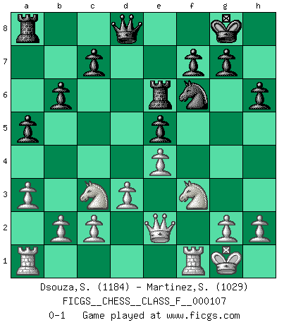 Last move : 0-1 2012 August 22 1:49:52 [Event "FICGS__CHESS__CLASS_F__000107"] [Site "FICGS"] [Date "2012.03.15"] [Round "1"] [White "Dsouza,Stanislaus"] [Black "Martinez,Silvio"] [Result "0-1"] [WhiteElo "1184"] [BlackElo "1029"] 1.e4 e5 2.Nf3 Nc6 3.Bc4 Nf6 4.d3 Bc5 5.Be3 O-O 6.Bxc5 Re8 7.O-O b6 8.Be3 d5 9.exd5 Nb4 10.a3 Nbxd5 11.Nc3 Nxe3 12.fxe3 h6 13.e4 Be6 14.Bxe6 Rxe6 15.Qe2 a5 0-1 This chess game has been lost on time (started : 2012.03.15 22:7:29) Two knights defense (Modern Bishop's Opening) Kingside Castling by player Black (move 5) Kingside Castling by player White (move 7) Player Black won this chess game. Follow this game move after move (download)When your house is on fire, you can't be bothered with the neighbors. Or, as we say in Chess, if your King is under attack you don't worry about losing a Pawn on the Queen's side. (Gary Kasparov) Wenn du auf das Glück wartest, wird das Leben ziemlich langweilig. (Mikhail Nekhemyevich Tal) El pensamiento metódico es mas útil en el Ajedrez que la inspiración. (C. J. S. Purdy) En blitz, le Cavalier l'emporte sur le Fou. (Vlastimil Hort) All the biggest technological inventions created by man - the airplane, the automobile, the computer - says little about his intelligence, but speaks volumes about his laziness. (Mark Kennedy)