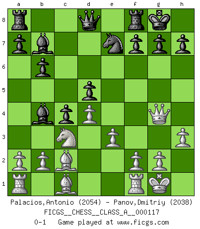 Last move : 0-1 2012 September 21 19:53:58 [Event "FICGS__CHESS__CLASS_A__000117"] [Site "FICGS"] [Date "2012.03.16"] [Round "1"] [White "Palacios,Antonio"] [Black "Panov,Dmitriy"] [Result "0-1"] [WhiteElo "2054"] [BlackElo "2038"] 1.c4 Nf6 2.Nc3 e6 3.d4 Bb4 4.e3 O-O 5.Bd3 d5 6.Nf3 c5 7.O-O Nc6 8.h3 b6 9.cxd5 exd5 10.Ne5 Bb7 11.Ng4 Nxg4 12.Qxg4 c4 13.Bc2 Ne7 0-1 English Opening Kingside Castling by player Black (move 4) Kingside Castling by player White (move 7) Player Black won this chess game. Follow this game move after move (download)Bobby is the finest Chess player this country ever produced. His memory for the moves, his brilliance in dreaming up combinations, and his fierce determination to win are uncanny. (John Collins) Schon mancher Spieler hat aufgegeben, um zu vermeiden, daß er eine Figur verliert. (Savielly Grigorievitsch Tartakower) El Ajedrez se juega con la mente... ¡no con las manos!. (Renaud y Kahn) On peut tirer plus d'utilité d'une partie perdue que de 100 parties gagnées. (Capablanca) In God we trust, all others we virus scan. (Anonymous)