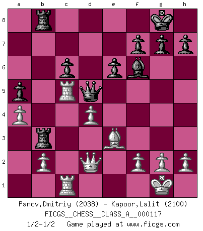 Last move : 1/2-1/2 2012 September 8 8:15:9 [Event "FICGS__CHESS__CLASS_A__000117"] [Site "FICGS"] [Date "2012.03.16"] [Round "1"] [White "Panov,Dmitriy"] [Black "Kapoor,Lalit"] [Result "1/2-1/2"] [WhiteElo "2038"] [BlackElo "2100"] 1.e4 c5 2.c3 Nf6 3.e5 Nd5 4.d4 cxd4 5.cxd4 d6 6.Nf3 Nc6 7.Bc4 Nb6 8.Bb5 dxe5 9.Nxe5 Bd7 10.Nxd7 Qxd7 11.Nc3 e6 12.O-O Rd8 13.a4 Nd5 14.Be3 Be7 15.Rc1 O-O 16.Nxd5 Qxd5 17.Bxc6 bxc6 18.Qe2 a5 19.Rc4 Rb8 20.Rfc1 Rb6 21.Bf4 Bf6 22.Qd2 Rb3 23.Be3 Rfb8 24.Rc5 1/2-1/2 Sicilian : Alapin's variation (2.c3) Kingside Castling by player White (move 12) Kingside Castling by player Black (move 15) This chess game ended in a draw. Follow this game move after move (download)It's always better to sacrifice your opponent's men. (Savielly Tartakover) Mutter, ich bin eben Ex-Weltmeister geworden. --beim nach Hause Kommen nach dem Verlust des WM-Titels an Mihail Botvinnik -- (Mikhail Nekhemyevich Tal) No puedes jugar al Ajedrez si eres de corazón noble. (Proverbio Francés) Un footballeur joue avec ses pieds, parfois avec sa tête. Un joueur d'échecs ne joue qu'avec sa tête. Et quand il ne joue plus, il meurt. (Jacob Murray) Over-the-board chess is the favorite of mortals, correspondence chess is the favorite of the gods. (Eduard Dyckhoff)