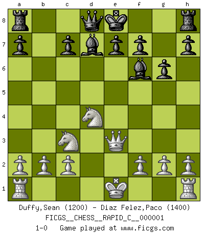 Last move : 1-0 2006 July 28 3:3:19 [Event "FICGS__CHESS__RAPID_C__000001"] [Site "FICGS"] [Date "2006.05.12"] [Round "1"] [White "Duffy,Sean"] [Black "Diaz Felez,Paco"] [Result "1-0"] [WhiteElo "1200"] [BlackElo "1400"] 1.e4 Nf6 2.e5 Nd5 3.d4 d6 4.Nf3 g6 5.Bc4 Nb6 6.Qe2 Nxc4 7.Qxc4 Bg7 8.Bf4 Be6 9.Qb5+ Bd7 10.Qxb7 Nc6 11.Qb3 Nxd4 12.Nxd4 dxe5 13.Bxe5 Bxe5 14.Qe3 Bf6 15.Nc3 1-0 This chess game has been lost on time (started : 2006.05.12 15:29:17) Alekhine's defense : Modern, Fianchetto variation Player White won this chess game. Follow this game move after move (download)Every Pawn is a potential Queen. (James Mason) Der Traum, für den ich lebe, ist der von einem freien Russland. Viele mögen sagen: Russland hat doch ein Parlament, einen gewählten Präsidenten. Aber ich spüre, dass in meiner Heimat die Angst wiederkehrt. Eine Angst, sich frei zu äußern, bestimmte Dinge zu tun (Garry Kasparov) Sin errores no puede haber brillantez. (Emanuel Lasker) 'L'échange des dames est un coup dur pour les deux adversaires...' Un journaliste lors d'une partie du match Spassky-Fischer Coffee just isn't my cup of tea. (Unknown)