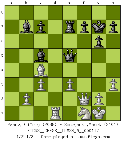 Last move : 1/2-1/2 2012 August 5 9:15:39 [Event "FICGS__CHESS__CLASS_A__000117"] [Site "FICGS"] [Date "2012.03.16"] [Round "1"] [White "Panov,Dmitriy"] [Black "Soszynski,Marek"] [Result "1/2-1/2"] [WhiteElo "2038"] [BlackElo "2101"] 1.e4 e5 2.Nf3 Nc6 3.Bb5 a6 4.Ba4 Nf6 5.O-O Be7 6.Re1 b5 7.Bb3 d6 8.c3 O-O 9.h3 Nb8 10.d4 Nbd7 11.a4 Bb7 12.Qe2 Nxe4 13.axb5 axb5 14.Rxa8 Qxa8 15.Qxb5 Nef6 16.dxe5 dxe5 17.Qe2 e4 18.Nd4 Nc5 19.Bc2 Re8 20.Nb5 Qc8 21.Be3 Nd5 22.Nd2 Qd7 23.Rd1 Nxe3 24.fxe3 Nd3 25.Nxe4 Qxb5 26.Bxd3 Qe5 27.Nd2 Bc5 28.Nf1 g6 29.Bc4 Re7 30.Qf2 Kg7 1/2-1/2 Ruy Lopez : Closed Kingside Castling by player White (move 5) Kingside Castling by player Black (move 8) This chess game ended in a draw. Follow this game move after move (download)I believe that Chess possesses a magic that is also a help in advanced age. A rheumatic knee is forgotten during a game of Chess and other events can seem quite unimportant in comparison with a catastrophe on the chessboard. (Vlastimil Hort) Ja, jede Frau in Holland liebt mich bestimmt, und alle Männer hassen mich. (Loek van Wely) Bobby Fischer es el jugador de Ajedrez mas grande que jamás haya existido. (Ken Smith) Les échecs sont plus proches de l'art de l'assassinat que de l'art de la guerre. (Arturo Perez-Reverte) I live to kill Traxler counterattack. (Ilmars Cirulis)
