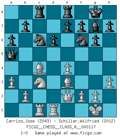 Last move : 1-0 2012 September 29 9:6:0 [Event "FICGS__CHESS__CLASS_A__000117"] [Site "FICGS"] [Date "2012.03.16"] [Round "1"] [White "Carrizo,Jose"] [Black "Schiller,Wilfried"] [Result "1-0"] [WhiteElo "2043"] [BlackElo "2012"] 1.e4 c5 2.d4 cxd4 3.c3 dxc3 4.Nxc3 Nc6 5.Nf3 d6 6.Bc4 a6 7.O-O Nf6 8.Qe2 Bg4 9.h3 Bxf3 10.Qxf3 g6 11.Rd1 Bg7 12.Bf4 Qa5 13.Qe2 O-O 14.Rac1 Rac8 15.a3 Rfe8 16.Be3 1-0 Sicilian : Smith-Morra gambit Kingside Castling by player White (move 7) Kingside Castling by player Black (move 13) Player White won this chess game. Follow this game move after move (download)Chess is the art which expresses the science of logic. (Mikhail Botvinnik) Darum geht es im Schach. Einen Tag gibst du deinem Gegner eine Lektion, am nächsten Tag gibt er dir eine. (Robert James Fischer) Fischer deseaba darle a los Rusos una sopa de su propia medicina. (Larry Evans) Les échecs, c'est l'imagination. (David Bronstein) When you don't know what to do, walk fast and look worried. (Anonymous)