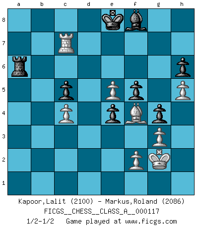 Last move : 1/2-1/2 2012 September 10 14:36:58 [Event "FICGS__CHESS__CLASS_A__000117"] [Site "FICGS"] [Date "2012.03.16"] [Round "1"] [White "Kapoor,Lalit"] [Black "Markus,Roland"] [Result "1/2-1/2"] [WhiteElo "2100"] [BlackElo "2086"] 1.e4 e5 2.Nf3 Nc6 3.Bb5 a6 4.Ba4 Nf6 5.O-O Be7 6.Re1 b5 7.Bb3 O-O 8.c3 d6 9.h3 Bb7 10.d4 Re8 11.Nbd2 Bf8 12.a3 h6 13.Bc2 d5 14.dxe5 Nxe5 15.Nxe5 Rxe5 16.Nf3 Re8 17.e5 Ne4 18.Qe2 c5 19.Bf4 g5 20.Bh2 f5 21.a4 Qb6 22.h4 g4 23.Nd2 Rad8 24.Nxe4 dxe4 25.Qe3 Rd7 26.axb5 axb5 27.Bb3+ Bd5 28.Rad1 Qe6 29.Bxd5 Rxd5 30.Rxd5 Qxd5 31.Bf4 Qe6 32.Rd1 Kf7 33.h5 Ra8 34.g3 Ra6 35.Qd2 Be7 36.Qd7 Qxd7 37.Rxd7 b4 38.Rc7 bxc3 39.bxc3 Ke8 40.Rc8+ Kf7 41.Kg2 Bf8 42.Be3 Re6 43.Rc7+ Ke8 44.Bf4 Ra6 45.c4 1/2-1/2 Ruy Lopez : Closed, 7...O-O Kingside Castling by player White (move 5) Kingside Castling by player Black (move 7) This chess game ended in a draw. Follow this game move after move (download)I look one move ahead... the best ! (Siegbert Tarrasch) Am wohlsten fühle ich mich, wenn ich sehe, wie sich mein Gegner im Todeskampf windet. (Robert James Fischer) Repentinamente, me resultaba obvio en mi analisis que yo había pasado por alto lo que Fischer había visto en el tablero con la mas grande facilidad. (Mikhail Botvinnik) Roi des jeux et jeu des rois, les échecs portent en eux un sentiment d'infini. Ils donnent à celui qui s'est efforcé d'en approfondir les arcanes l'impression de n'être pas à la mesure de l'homme; en fait, ils constituent un résumé de l'univers, un microcosme, et figurent cette grande échelle qui, dans les plans de la lumière descend jusqu'à la matière, qui des abîmes insondables remonte jusqu'en l'infini de Dieu. (Pyrame) Unless I accept my faults I will most certainly doubt my virtues. (Hugh Prather)