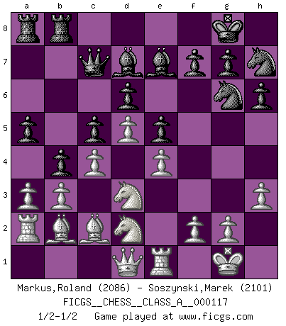 Last move : 1/2-1/2 2012 April 17 8:5:25 [Event "FICGS__CHESS__CLASS_A__000117"] [Site "FICGS"] [Date "2012.03.16"] [Round "1"] [White "Markus,Roland"] [Black "Soszynski,Marek"] [Result "1/2-1/2"] [WhiteElo "2086"] [BlackElo "2101"] 1.e4 e5 2.Nf3 Nc6 3.Bb5 a6 4.Ba4 Nf6 5.O-O Be7 6.Re1 b5 7.Bb3 d6 8.c3 O-O 9.h3 Nb8 10.d4 Nbd7 11.c4 c6 12.Nc3 b4 13.Na4 c5 14.d5 Re8 15.Bc2 Nf8 16.a3 a5 17.b3 Ng6 18.Nb2 Bd7 19.Nd3 h6 20.Bb2 Qc7 21.Ra2 Reb8 22.Nd2 Nh7 1/2-1/2 Ruy Lopez : Closed Kingside Castling by player White (move 5) Kingside Castling by player Black (move 8) This chess game ended in a draw. Follow this game move after move (download)All Chess players should have a hobby. (Savielly Tartakower) Gewöhnliche Menschen denken nur daran, wie sie ihre Zeit verbringen. Ein intelligenter Mensch versucht, sie auszunutzen. (Arthur Schopenhauer) Hoy en día, si tu no eres un Gran Maestro a los 14 años, es mejor que lo olvides. (Anand Viswanathan) On peut tirer plus d'utilité d'une partie perdue que de 100 parties gagnées. (Capablanca) The real danger is not that computers will begin to think like men, but that men will begin to think like computers. (Sydney J. Harris)