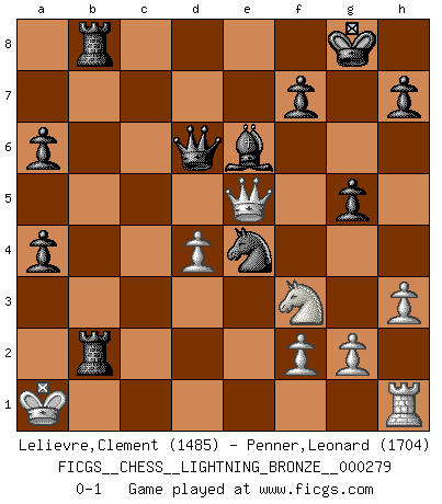 Last move : 0-1 2012 March 17 22:48:9 [Event "FICGS__CHESS__LIGHTNING_BRONZE__000279"] [Site "FICGS"] [Date "2012.03.17"] [Round "1"] [White "Lelievre,Clement"] [Black "Penner,Leonard"] [Result "0-1"] [WhiteElo "1485"] [BlackElo "1704"] 1.e4 e6 2.d4 d5 3.exd5 exd5 4.Nc3 Bb4 5.Bd2 Nf6 6.Qe2+ Be6 7.Qb5+ Nc6 8.Nf3 O-O 9.Qxb7 Re8 10.O-O-O Qd6 11.Bb5 Na5 12.Qa6 c6 13.Ba4 Reb8 14.a3 Bxa3 15.Nb5 cxb5 16.Qxa5 bxa4 17.Bc3 Ne4 18.Kb1 Bb4 19.Bxb4 Rxb4 20.Ka2 Rab8 21.Rb1 g5 22.h3 a6 23.c4 dxc4 24.Qe5 c3 25.Ka1 cxb2+ 26.Rxb2 Rxb2 0-1 French : Exchange variation Kingside Castling by player Black (move 8) Queenside Castling by player White (move 10) Player Black won this chess game. Follow this game move after move (download)Fischer is completely natural. He plays no roles. He's like a child. Very, very simple. (Zita Rajcsanyi) Schach ist eine Sache der genauen Beurteilung, wann man zuschlagen und wann man sich ducken muss. (Robert James Fischer) El Ajedrez lo es todo: arte, ciencia y deporte. (Anatoly Karpov) Les échecs, c'est la lutte contre l'erreur. (Johannes Zukertort) Your best chance to get a Royal Flush in a casino is in the bathroom. (Anonymous)
