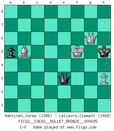 Last move : 1-0 2012 March 18 10:40:52 [Event "FICGS__CHESS__BULLET_BRONZE__000695"] [Site "FICGS"] [Date "2012.03.18"] [Round "1"] [White "Hakkinen,Jorma"] [Black "Lelievre,Clement"] [Result "1-0"] [WhiteElo "1386"] [BlackElo "1468"] 1.d4 d5 2.c4 dxc4 3.Nc3 Nf6 4.Nf3 Bf5 5.Bg5 Nc6 6.e3 e6 7.a3 b5 8.Be2 Be7 9.O-O O-O 10.Re1 Ne4 11.Bxe7 Qxe7 12.Rc1 Nxc3 13.bxc3 Rad8 14.h3 Qf6 15.g4 Be4 16.Kg2 Ne5 17.dxe5 Bxf3+ 18.Bxf3 Qxe5 19.Qe2 Rd3 20.Qc2 Rfd8 21.Red1 Rxd1 22.Rxd1 Rxd1 23.Qxd1 h5 24.gxh5 Qxc3 25.Qd8+ Kh7 26.Be4+ f5 27.Bc6 Qxa3 28.Qxc7 c3 29.h6 Qf8 30.Bxb5 Kxh6 31.Qxc3 Qe7 32.Qc6 a5 33.f4 g5 34.fxg5+ Qxg5+ 35.Kf3 Qh5+ 36.Kf4 Qh4+ 37.Ke5 Qg3+ 38.Kxe6 Qxe3+ 39.Kxf5 Kh5 40.Qg6+ 1-0 Queen's gambit accepted Kingside Castling by player White (move 9) Kingside Castling by player Black (move 9) 10 pieces endgame at move 34 : White KQBPP , Black KQPPP WHITE : King + 1 Queen 1 Bishop 2 Pawns BLACK : King + 1 Queen 3 Pawns 9 pieces endgame at move 38 : White KQBPP , Black KQPP WHITE : King + 1 Queen 1 Bishop 2 Pawns BLACK : King + 1 Queen 2 Pawns 8 pieces endgame at move 38 : White KQBP , Black KQPP WHITE : King + 1 Queen 1 Bishop 1 Pawn BLACK : King + 1 Queen 2 Pawns 7 pieces endgame at move 39 : White KQBP , Black KQP WHITE : King + 1 Queen 1 Bishop 1 Pawn BLACK : King + 1 Queen 1 Pawn Player White won this chess game. Follow this game move after move (download)Life is a kind of Chess, with struggle, competition, good and ill events. (Benjamin Franklin) Man gibt nur Pakete auf. (Paul Keres) Nunca nadie ha ganado una partida de Ajedrez rindiendose. (Unknown) Ce qui caractérise les parties de combat, c'est que si le défenseur a constamment de difficiles problèmes à résoudre, l'attaquant doit chercher sans relâche de nouvelles possibilités d'attaque. (Koblentz) Industry executives and analysts often mistakenly talk about strategy as if it were some kind of chess match. But in chess, you have just two opponents, each with identical resources, and with luck playing a minimal role. The real world is much more like a poker game, with multiple players trying to make the best of whatever hand fortune has dealt them. In our industry, Bill Gates owns the table until someone proves otherwise. (David Moschella, 'Computerworld')