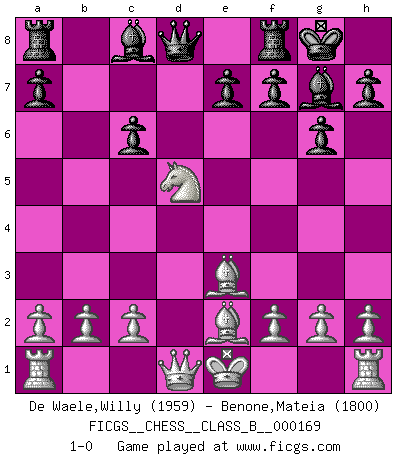 Last move : 1-0 2012 August 24 2:15:28 [Event "FICGS__CHESS__CLASS_B__000169"] [Site "FICGS"] [Date "2012.03.21"] [Round "1"] [White "De Waele,Willy"] [Black "Benone,Mateia"] [Result "1-0"] [WhiteElo "1959"] [BlackElo "1800"] 1.e4 c5 2.Nf3 Nc6 3.d4 cxd4 4.Nxd4 g6 5.Nc3 Bg7 6.Be3 Nf6 7.Bc4 O-O 8.Be2 d5 9.Nxc6 bxc6 10.exd5 Nxd5 11.Nxd5 1-0 This chess game has been lost on time (started : 2012.03.21 20:20:36) Sicilian : Accelerated Fianchetto, Modern variation with Bc4 Kingside Castling by player Black (move 7) Player White won this chess game. Follow this game move after move (download)Robert Fischer is a law unto himself. (Larry Evans) Ich suche im Schach immer etwas Eigenes. Riskantes Spiel im Stile schachlicher Musketiere ist nicht meine Sache, auch wenn es vielen Freunden scharfer Wendungen gefällt. (Anatoly Karpov) La mitad de las variaciones que son calculadas en una partida de torneo, resultan ser completamente superfluas. Desafortunadamente, nadie sabe por adelantado cual mitad. (Jan Tinman) Un millionnaire : 'Monsieur Steinitz ! Vous ne participez aux tournois que pour l'argent, alors que moi je n'y viens que pour l'honneur.' Steinitz : 'Chacun joue pour ce qu'il n'a pas'... I've never seen so many men wasted so badly. (Blondie in The Good, The Bad and The Ugly)