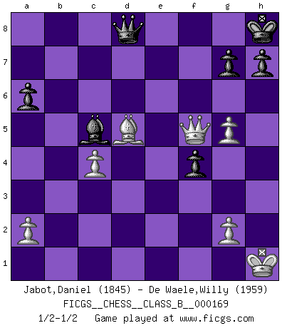 Last move : 1/2-1/2 2012 September 13 11:19:3 [Event "FICGS__CHESS__CLASS_B__000169"] [Site "FICGS"] [Date "2012.03.21"] [Round "1"] [White "Jabot,Daniel"] [Black "De Waele,Willy"] [Result "1/2-1/2"] [WhiteElo "1845"] [BlackElo "1959"] 1.e4 c5 2.Nf3 d6 3.d4 cxd4 4.Nxd4 Nf6 5.Nc3 a6 6.Bg5 e6 7.f4 Qb6 8.Qd2 Qxb2 9.Rb1 Qa3 10.f5 Nc6 11.fxe6 fxe6 12.Nxc6 bxc6 13.Be2 Be7 14.O-O O-O 15.Rb3 Qc5+ 16.Be3 Qe5 17.Bf4 Qc5+ 18.Kh1 Ng4 19.h3 e5 20.Na4 Qa7 21.Bc4+ Kh8 22.hxg4 exf4 23.Nb6 d5 24.exd5 cxd5 25.Bxd5 Rb8 26.Nxc8 Rbxc8 27.Rh3 Qb6 28.Re1 Bg5 29.Re6 Qd8 30.Qd3 Bh4 31.c4 Re8 32.Qf5 Rxe6 33.Qxe6 Rb8 34.Rb3 Rc8 35.Rb1 Rb8 36.Rxb8 Qxb8 37.Qe4 Bf2 38.Qf5 Bd4 39.Qe4 Bc5 40.Qf5 Qd8 41.g5 1/2-1/2 Sicilian : Najdorf, 7...Qb6 Kingside Castling by player White (move 14) Kingside Castling by player Black (move 14) This chess game ended in a draw. Follow this game move after move (download)Nowadays, when you're not a grandmaster at 14, you can forget about it. (Anand Viswanathan) Das Schach ist nichts für kleine Geister, es beansprucht einen vollen Mann, der sich nicht sklavisch an das Überlieferte hält, sondern selbständig die Tiefen des Spiels zu ergründen sucht. (Wilhelm Steinitz) El Ajedrez es un juego terrible. Si no dominas el centro, tu oponente tiene una posición mas libre. Si tu tienes el centro, entonces realmente tienes algo de que preocuparte. (Siegbert Tarrasch) Celui qui prend des risques peut perdre, celui qui n'en prend pas perd toujours. (Xavier Tartacover) A good aphorism is too hard for the tooth of time, and is not worn away with the centuries, although it serves as food for every speech. (Friedrich Nietzsche)