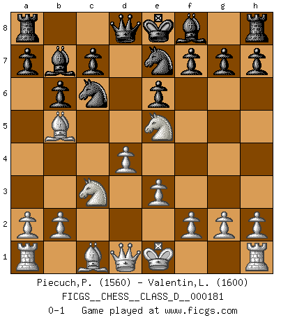 Last move : 0-1 2012 June 1 2:56:18 [Event "FICGS__CHESS__CLASS_D__000181"] [Site "FICGS"] [Date "2012.03.22"] [Round "1"] [White "Piecuch,Patryk"] [Black "Valentin,Laurentiu"] [Result "0-1"] [WhiteElo "1560"] [BlackElo "1600"] 1.d4 d5 2.c4 e6 3.Nc3 Nf6 4.Nf3 b6 5.cxd5 Nxd5 6.e3 Bb7 7.Bb5+ Nc6 8.Ne5 Nde7 0-1 This chess game has been lost on time (started : 2012.03.22 2:49:46) QGD : 4.Nf3 Player Black won this chess game. Follow this game move after move (download)Chess makes man wiser and clear-sighted. (Vladimir Putin) Ich glaube, ich kenne inzwischen die Gründe für mein Versagen: schachliche Charakterfehler. Ich war nie ein Wunderkind und in meiner gesamten menschlichen Entwicklung immer zu langsam. (Viktor Kortschnoi) Si no le temes a Spassky, entonces elimino el elemento del dinero. (Jim Slater) Si rien de grave n'est détecté lors de l'analyse d'une position, on joue alors le coup. Seconde règle de Blumenfeld. Remember : Your focus determines your reality. (Qui-Gon Jinn in Star Wars ep.1)
