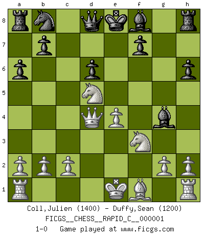 Last move : 1-0 2006 June 28 2:7:15 [Event "FICGS__CHESS__RAPID_C__000001"] [Site "FICGS"] [Date "2006.05.12"] [Round "1"] [White "Coll,Julien"] [Black "Duffy,Sean"] [Result "1-0"] [WhiteElo "1400"] [BlackElo "1200"] 1.e4 c5 2.Nf3 d6 3.d4 cxd4 4.Nxd4 Nf6 5.Nc3 a6 6.Bg5 e6 7.f4 e5 8.Nf3 Bg4 9.fxe5 h6 10.Bxf6 gxf6 11.exf6 Qxf6 12.Nd5 Qd8 13.Qd4 1-0 Sicilian : Najdorf, 7.f4 Player White won this chess game. Follow this game move after move (download)Examine moves that smite! A good eye for smites is far more important than a knowledge of strategical principles. (Purdy) Warum muß ich gegen diesen IDIOTEN verlieren? (Aaron Nimzowitsch) Si tu oponente te ofrece un empate, trata de averiguar porque piensa él que esta en una posición peor. (Nigel Short) J'ai toujours senti une vague pitié pour l'homme qui ne connaît rien aux échecs, tout comme j'en aurais pour un homme ignorant de l'amour. Les Echecs, comme la musique ou comme l'amour, ont le pouvoir de rendre heureux. (Siegbert Tarrasch) They say in chess you've got to kill the queen, and then you mate it... Oh I, do you ? (Red Hot Chili Peppers, Fortune faded)