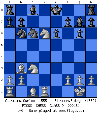 Last move : 1-0 2012 August 23 14:13:24 [Event "FICGS__CHESS__CLASS_D__000181"] [Site "FICGS"] [Date "2012.03.22"] [Round "1"] [White "Oliveira,Carlos"] [Black "Piecuch,Patryk"] [Result "1-0"] [WhiteElo "1555"] [BlackElo "1560"] 1.e4 c5 2.c3 Nf6 3.e5 Nd5 4.d4 cxd4 5.Nf3 Nc6 6.Bc4 Nb6 7.Bb3 d6 8.exd6 Qxd6 9.O-O g6 10.Ng5 e6 11.Ne4 Qd8 12.cxd4 Qxd4 13.Nbc3 Qxd1 14.Rxd1 Bg7 15.Nd6+ 1-0 This chess game has been lost on time (started : 2012.03.22 2:49:46) Sicilian : Alapin's variation (2.c3) Kingside Castling by player White (move 9) Player White won this chess game. Follow this game move after move (download)The hardest game to win is a won game. (Emanuel Lasker) Ich organisiere ein großes Turnier, was mich etwa 120000 Dollar kostet. Ich denke, das ist das erste Mal in der Schachgeschichte, daß ein Schachgroßmeister auch als Mäzen auftritt. (Miguel Najdorf) Yo no creo en la psicología. Yo creo en las buenas movidas. (Bobby Fischer) Echiquier : carré parfait, comme la Jérusalem nouvelle décrite par l'auteur de l'Apocalypse, huit cases sur huit, exaltation du chiffre 4, symbole du cosmos aux quatre horizons... où le noir et le blanc, l'ombre et la lumière, le mal et le bien s'entremêlent et se conjuguent. (Robert Couffignal, Le Gambit du poète) 'preceded by its own quotation yields a falsehood' preceded by its own quotation yields a falsehood. (W. V. O. Quine - Set Theory And Its Logic, 1953)