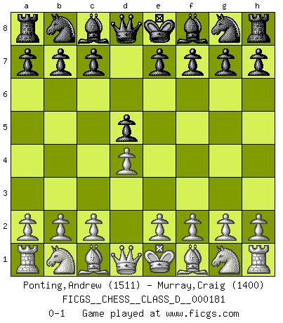 Last move : 0-1 2012 May 1 12:40:35 [Event "FICGS__CHESS__CLASS_D__000181"] [Site "FICGS"] [Date "2012.03.22"] [Round "1"] [White "Ponting,Andrew"] [Black "Murray,Craig"] [Result "0-1"] [WhiteElo "1511"] [BlackElo "1400"] 1.d4 d5 0-1 This chess game has been lost on time (started : 2012.03.22 2:49:46) Queen's pawn game Player Black won this chess game. Follow this game move after move (download)The most important feature of the Chess position is the activity of the pieces. This is absolutely fundamental in all phases of the game: Opening, Middlegame and especially Endgame. The primary constraint on a piece's activity is the Pawn structure. (Michael Stean) Wie kann ich Remis annehmen? Ich weiß ja gar nicht, wie ich stehe! (Fritz Sämisch) Sin errores no puede haber brillantez. (Emanuel Lasker) Le temps de noter son nom sur la feuille de partie, j'étais déjà en zeitnot ! D'un modeste amateur apparié lors de la première ronde d'un open contre le grand-maître Azmaïparashvili. If only faces could talk... (Pat Summerall, Sportscaster during the Super Bowl)
