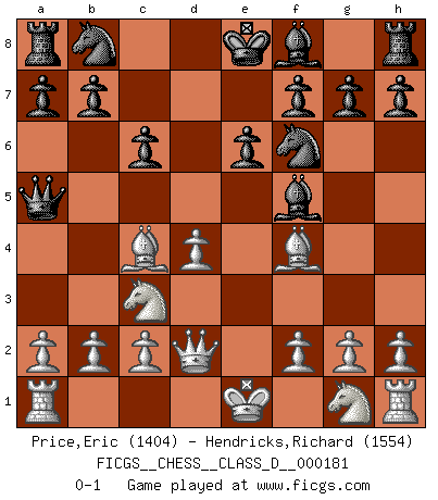 Last move : 0-1 2012 May 6 0:45:2 [Event "FICGS__CHESS__CLASS_D__000181"] [Site "FICGS"] [Date "2012.03.22"] [Round "1"] [White "Price,Eric"] [Black "Hendricks,Richard"] [Result "0-1"] [WhiteElo "1404"] [BlackElo "1554"] 1.e4 d5 2.exd5 Qxd5 3.Nc3 Qa5 4.d4 c6 5.Bf4 Nf6 6.Bc4 Bf5 7.Qd2 e6 0-1 This chess game has been lost on time (started : 2012.03.22 2:49:46) Scandinavian (centre counter) defense Player Black won this chess game. Follow this game move after move (download)All my games are real. (Bobby Fischer) Wenn ich Weiß habe gewinne ich weil ich Weiß habe, wenn ich Schwarz habe gewinne ich weil ich Bogoljubov bin. (Efim Bogoljubov) La última cosa en que Fischer estaba interesado era en tonterías, siempre y cuando el Ajedrez estuviera involucrado. (Elie Agur) Les échecs, c'est l'art d'analyser. (Mikhail Botvinnik) Memory is a crazy woman that hoards colored rags and throws away food. (Austin O'Malley)