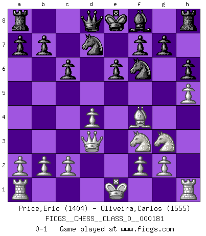 Last move : 0-1 2012 September 5 17:7:2 [Event "FICGS__CHESS__CLASS_D__000181"] [Site "FICGS"] [Date "2012.03.22"] [Round "1"] [White "Price,Eric"] [Black "Oliveira,Carlos"] [Result "0-1"] [WhiteElo "1404"] [BlackElo "1555"] 1.e4 c6 2.d4 d5 3.Nc3 dxe4 4.Nxe4 Bf5 5.Ng3 Bg6 6.h4 h6 7.Nf3 Nd7 8.h5 Bh7 9.Bd3 Bxd3 10.Qxd3 e6 11.Bf4 Ngf6 0-1 This chess game has been lost on time (started : 2012.03.22 2:49:46) Caro-Kann : Classical, 7...Nd7 Player Black won this chess game. Follow this game move after move (download)Even the laziest King flees wildly in the face of a double check ! (Aaron Nimzowitsch) Strategie ist, wie man ein Mädchen auf den Rücksitz bekommt. Taktik ist, was man tut, wenn man dann dort ist. (Anonymous) La señal de un Gran Maestro es su habilidad de ganar una partida rápidamente y sin dolor. (Irving Chernev) Les Echecs, c'est l'art de la guerre sans les charniers, c'est la résurrection des morts tombés au champ d'honneur, l'espoir perpétuel, la suprématie de l'intelligence sur la force, la culture de l'esprit. (F. Szpiner) Those who make the worst use of their time are the first to complain of its brevity. (Jean de la Bruyere)
