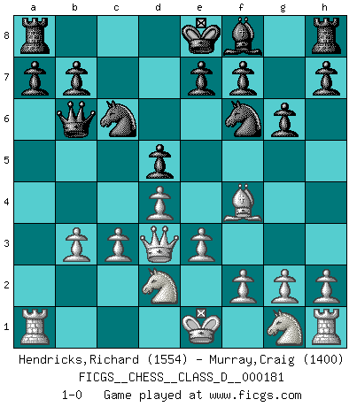 Last move : 1-0 2012 August 17 13:35:24 [Event "FICGS__CHESS__CLASS_D__000181"] [Site "FICGS"] [Date "2012.03.22"] [Round "1"] [White "Hendricks,Richard"] [Black "Murray,Craig"] [Result "1-0"] [WhiteElo "1554"] [BlackElo "1400"] 1.d4 d5 2.Bf4 Nf6 3.e3 c5 4.c3 Qb6 5.Qb3 c4 6.Qc2 Nc6 7.b3 cxb3 8.axb3 g6 9.Nd2 Bf5 10.Bd3 Bxd3 11.Qxd3 1-0 Queen's pawn, Mason variation Player White won this chess game. Follow this game move after move (download)Up to this point White has been following well-known analysis. But now he makes a fatal error: he begins to use his own head. (Siegbert Tarrasch) Frage des Reporters: -Worin besteht das Ziel von Gambiteröffnungen? Antwort: -Auf Kosten der Partie einen Ruf als Angriffspieler zu erwerben.- (Siegbert Tarrasch) Los errores estan ahí, esperando a que se cometan. (Savielly Tartakower) Vous savez, camarade Pachman, je n'éprouve pas de plaisir à être ministre, je jouerais plutôt aux échecs comme vous, ou alors ferais une révolution au Venezuela. (Che Guevara à Ludek Pachman, 'Checkmate in Prague', 1975) Ah, the Socrating method. The best way we have of teaching everything-apart from juggling chainsaws. (Gregory House, House M.D.)