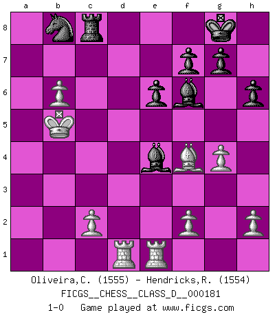 Last move : 1-0 2012 October 26 10:35:57 [Event "FICGS__CHESS__CLASS_D__000181"] [Site "FICGS"] [Date "2012.03.22"] [Round "1"] [White "Oliveira,Carlos"] [Black "Hendricks,Richard"] [Result "1-0"] [WhiteElo "1555"] [BlackElo "1554"] 1.e4 d5 2.exd5 Qxd5 3.Nc3 Qa5 4.d4 c6 5.Bc4 Bf5 6.Nf3 e6 7.Bd2 Qc7 8.Qe2 Be7 9.O-O-O b5 10.Bb3 a5 11.a4 Nf6 12.axb5 a4 13.Ba2 h6 14.Ne5 a3 15.g4 Bh7 16.Qc4 axb2+ 17.Kxb2 O-O 18.Bb3 Ba3+ 19.Kb1 Qa5 20.Qa4 Qxa4 21.Bxa4 Ne4 22.Nxe4 Rxa4 23.Nc3 Rxd4 24.Be3 Rb4+ 25.Ka2 Bb2 26.Nd3 Bxc3 27.Nxb4 Bxb4 28.Kb3 Be7 29.b6 c5 30.Bf4 c4+ 31.Kc3 Bf6+ 32.Kxc4 Rc8+ 33.Kb5 Be4 34.Rhe1 1-0 Scandinavian (centre counter) defense Queenside Castling by player White (move 9) Kingside Castling by player Black (move 17) Player White won this chess game. Follow this game move after move (download)When you play Bobby, it is not a question if you win or lose. It is a question if you survive. (Boris Spassky) Später, ... hatte ich zunehmend Erfolg in entscheidenden Partien. Vielleicht weil ich eine einfache Wahrheit erkannte: nicht nur ich hatte Angst, auch mein Gegner. (Mikhail Nekhemyevich Tal) Sin errores no puede haber brillantez. (Emanuel Lasker) Il n'y a plus de joueurs du niveau de Jacob Murray dont la seule quête est le beau jeu, le plaisir de voir les pièces construire quelque chose. Sur 10 idées à la minute, 9 seront sans intérêt, la dernière s'avèrera géniale. (Christian Bauer) There are more things in heaven and earth than practically anywhere else. (Unknown)