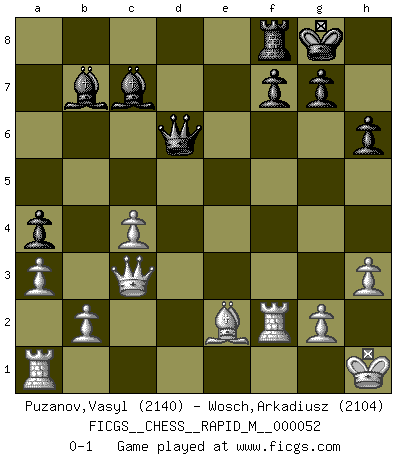 Last move : 0-1 2012 September 10 22:36:12 [Event "FICGS__CHESS__RAPID_M__000052"] [Site "FICGS"] [Date "2012.03.22"] [Round "1"] [White "Puzanov,Vasyl"] [Black "Wosch,Arkadiusz"] [Result "0-1"] [WhiteElo "2140"] [BlackElo "2104"] 1.e4 c5 2.Nf3 Nc6 3.d4 cxd4 4.Nxd4 Nf6 5.Nxc6 bxc6 6.Nc3 e5 7.Bc4 Bb4 8.Bg5 h6 9.Bxf6 Qxf6 10.O-O O-O 11.Qd3 Qd6 12.Qf3 Qg6 13.Ne2 Bc5 14.a3 a5 15.Nc1 d6 16.Nb3 Bb6 17.h3 d5 18.exd5 e4 19.Qc3 a4 20.Nc1 e3 21.Kh1 cxd5 22.Bxd5 Ra5 23.Bf3 exf2 24.Ne2 Ba6 25.Qb4 Re5 26.c4 Rxe2 27.Bxe2 Bc7 28.Qc3 Bb7 29.Rxf2 Qd6 0-1 Sicilian defense Kingside Castling by player White (move 10) Kingside Castling by player Black (move 10) Player Black won this chess game. Follow this game move after move (download)Chess is 99 percent tactics. (Teichmann) Nie in meinem Leben habe ich die französische Verteidigung gespielt, welche die Stumpfsinnigste von allen ist. (Wilhelm Steinitz) No solamente yo pronostico su triunfo sobre Botvinnik, sino que me adelanto y digo que probablemente Fischer es el jugador de Ajedrez mas grande que haya existido. (John Collins) Je menace de comprendre la position. (Anonyme) Kids, you tried your best and you failed miserably. The lesson is, never try. (Simpsons)