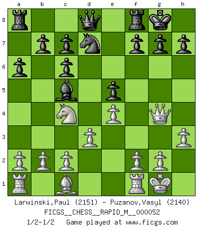 Last move : 1/2-1/2 2012 May 7 9:20:40 [Event "FICGS__CHESS__RAPID_M__000052"] [Site "FICGS"] [Date "2012.03.22"] [Round "1"] [White "Larwinski,Paul"] [Black "Puzanov,Vasyl"] [Result "1/2-1/2"] [WhiteElo "2151"] [BlackElo "2140"] 1.e4 e5 2.Nf3 Nc6 3.Bb5 a6 4.Bxc6 dxc6 5.O-O Bg4 6.h3 Bxf3 7.Qxf3 Nf6 8.d3 Bc5 9.Nd2 O-O 10.Nc4 Nd7 11.Qg4 1/2-1/2 Ruy Lopez : Exchange variation, 5.O-O Kingside Castling by player White (move 5) Kingside Castling by player Black (move 9) This chess game ended in a draw. Follow this game move after move (download)When I asked Fischer why he had not played a certain move in our game, he replied: 'Well, you laughed when I wrote it down !' (Mikhail Tal) Ich glaube nicht an Psychologie, ich glaube an gute Züge. (Robert James Fischer) No es tiempo de jugar al Ajedrez cuando la casa esta en llamas. (Proverbio Italiano) Aucun coup ne doit être joué sans but. (Pedro Damiano) When it is a question of money, everybody is of the same religion. (Voltaire)