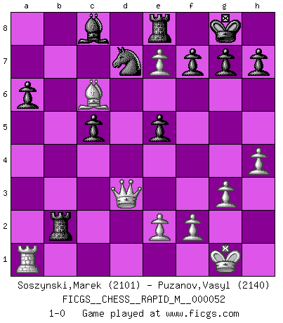 Last move : 1-0 2012 May 25 0:3:35 [Event "FICGS__CHESS__RAPID_M__000052"] [Site "FICGS"] [Date "2012.03.22"] [Round "1"] [White "Soszynski,Marek"] [Black "Puzanov,Vasyl"] [Result "1-0"] [WhiteElo "2101"] [BlackElo "2140"] 1.d4 Nf6 2.c4 c5 3.d5 e6 4.Nc3 d6 5.Nf3 Nbd7 6.g3 exd5 7.cxd5 a6 8.a4 Ne5 9.Nxe5 dxe5 10.Bg2 Bd6 11.O-O O-O 12.a5 b5 13.axb6 Qxb6 14.Bg5 Nd7 15.Ne4 Rb8 16.Bd2 Be7 17.d6 Bd8 18.Be3 Qb5 19.Nc3 Qxb2 20.Qd3 Rb3 21.Bd2 Bg5 22.Rfb1 Bxd2 23.Rxb2 Rxb2 24.Nd5 Bg5 25.h4 Bd8 26.Ne7+ Bxe7 27.dxe7 Re8 28.Bc6 1-0 Benoni defense Kingside Castling by player White (move 11) Kingside Castling by player Black (move 11) Player White won this chess game. Follow this game move after move (download)Chess is a fairy tale of 1001 blunders. (Savielly Tartakower) Gegen einen Schachcomputer zu verlieren ist wie Löcher in den Strümpfen zuhaben. Es ist nicht peinlich, solange man der einzige ist der es weiß. (Anonymous) Bobby solo arroja las piezas y solas caen en las casillas correctas. (Miguel Najdorf ) Mais n'est-ce pas déjà le limiter injurieusement que d'appeler les échecs un jeu? N'est-ce pas aussi une science, un art, ou quelque chose qui, comme le cercueil de Mahomet entre ciel et terre, est suspendu entre l'un et l'autre, et qui réunit un nombre incroyable de contraires ? (Stefan Zweig) After growing wildly for years, the field of computing appears to be reaching its infancy. (John Pierce)