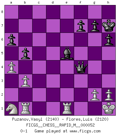 Last move : 0-1 2012 September 10 22:38:9 [Event "FICGS__CHESS__RAPID_M__000052"] [Site "FICGS"] [Date "2012.03.22"] [Round "1"] [White "Puzanov,Vasyl"] [Black "Flores,Luis"] [Result "0-1"] [WhiteElo "2140"] [BlackElo "2120"] 1.e4 c5 2.Nf3 d6 3.d4 cxd4 4.Nxd4 Nf6 5.Nc3 a6 6.Be3 e5 7.Nb3 Be6 8.Be2 Be7 9.O-O Nbd7 10.f4 Rc8 11.f5 Bc4 12.Bxc4 Rxc4 13.Qd3 Rc8 14.Rf3 Nb6 15.Rg3 Nc4 16.Rb1 Nh5 17.Rh3 Nxe3 18.Qxe3 Nf4 19.Rf3 b5 20.a3 O-O 21.Kh1 d5 22.exd5 Nxd5 23.Nxd5 Qxd5 24.Rf2 h6 25.Rd2 Qc4 26.Re2 Bg5 27.Qxe5 Bf6 28.Qe3 Rfe8 29.Qxe8+ Rxe8 30.Rxe8+ Kh7 31.R8e1 Qxc2 32.Na1 Qxf5 33.b3 Be5 34.a4 Qf4 0-1 Sicilian : Najdorf, Byrne (English) attack Kingside Castling by player White (move 9) Kingside Castling by player Black (move 20) Player Black won this chess game. Follow this game move after move (download)White lost because he failed to remember the right continuation and had to think up the moves himself. (Siegbert Tarrasch) Spiel ein langweiliges Spiel zu Ende und lustige Dinge können passieren. (Hans Ree) El Ajedrez, como cualquier actividad creativa, solo puede existir a través del esfuerzo combinado de aquellos que tienen talento creativo y de aquellos que poseen la habilidad de organizar su trabajo creativo. (Mikhail Botvinnik) Echiquier : carré parfait, comme la Jérusalem nouvelle décrite par l'auteur de l'Apocalypse, huit cases sur huit, exaltation du chiffre 4, symbole du cosmos aux quatre horizons... où le noir et le blanc, l'ombre et la lumière, le mal et le bien s'entremêlent et se conjuguent. (Robert Couffignal, Le Gambit du poète) Pushing plastic is for the many, pushing virtual pieces is for the fewer, pushing wood is for the very few. (Normajean Yates)