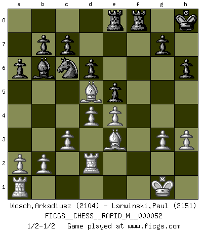 Last move : 1/2-1/2 2012 April 3 19:5:57 [Event "FICGS__CHESS__RAPID_M__000052"] [Site "FICGS"] [Date "2012.03.22"] [Round "1"] [White "Wosch,Arkadiusz"] [Black "Larwinski,Paul"] [Result "1/2-1/2"] [WhiteElo "2104"] [BlackElo "2151"] 1.e4 e5 2.Nf3 Nc6 3.Bc4 Bc5 4.c3 Nf6 5.d3 O-O 6.O-O d6 7.Bb3 h6 8.Nbd2 a6 9.Re1 Ng4 10.Re2 Nf6 11.Nf1 Nh5 12.Be3 Bg4 13.Rd2 Qf6 14.d4 Bb6 15.h3 Bxf3 16.Qxf3 Qxf3 17.gxf3 Kh8 18.Ng3 Nxg3 19.fxg3 f5 20.Bd5 fxe4 21.fxe4 Rae8 1/2-1/2 Giuoco Piano Kingside Castling by player Black (move 5) Kingside Castling by player White (move 6) This chess game ended in a draw. Follow this game move after move (download)I prefer to lose a really good game than to win a bad one. (David Levy) Moralische Siege zählen nicht. (Savielly Grigorievitsch Tartakower) Desconfianza es la característica mas necesaria de un jugador de Ajedrez. (Siegbert Tarrasch) RxDa4 pat (...) Tomorrow's what you make of it. (Horatio Caine, C.S.I. Miami)