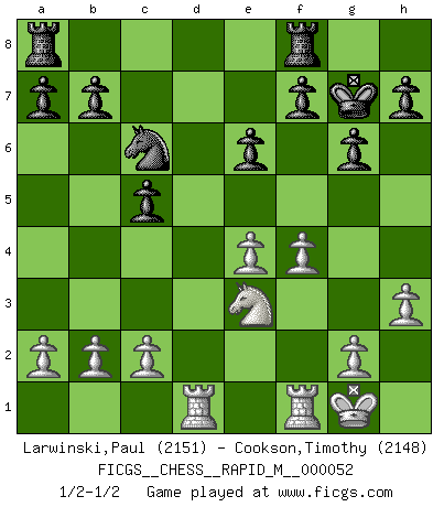 Last move : 1/2-1/2 2012 May 3 21:55:45 [Event "FICGS__CHESS__RAPID_M__000052"] [Site "FICGS"] [Date "2012.03.22"] [Round "1"] [White "Larwinski,Paul"] [Black "Cookson,Timothy"] [Result "1/2-1/2"] [WhiteElo "2151"] [BlackElo "2148"] 1.e4 c5 2.Nf3 d6 3.Nc3 Nf6 4.Bb5+ Bd7 5.Bxd7+ Qxd7 6.d4 cxd4 7.Qxd4 g6 8.O-O Nc6 9.Qd3 Bg7 10.Nd5 Ng4 11.h3 Nge5 12.Nxe5 Nxe5 13.Qb3 e6 14.Bh6 O-O 15.Bxg7 Kxg7 16.Ne3 Qc6 17.Qb4 Qc5 18.Qxc5 dxc5 19.f4 Nc6 20.Rad1 1/2-1/2 Sicilian Kingside Castling by player White (move 8) Kingside Castling by player Black (move 14) This chess game ended in a draw. Follow this game move after move (download)Winning isn't everything... but losing is nothing. (Mednis) Das ganze Leben mit einer Ehefrau ist wie ein Endspiel mit ungleichfarbigen Läufern. (Viktor Kortschnoi) Uno no tiene que jugar muy bien, es suficiente jugar mejor que el oponente. (Siegbert Tarrasch) Le système Elo représente seulement une moyenne. Il est simplement un indicateur de votre stabilité. (Anatoli Karpov) When you stop learning you start dying. (Scott Adams)
