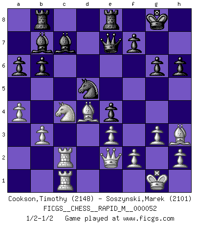 Last move : 1/2-1/2 2012 May 18 5:23:22 [Event "FICGS__CHESS__RAPID_M__000052"] [Site "FICGS"] [Date "2012.03.22"] [Round "1"] [White "Cookson,Timothy"] [Black "Soszynski,Marek"] [Result "1/2-1/2"] [WhiteElo "2148"] [BlackElo "2101"] 1.e3 Nf6 2.c4 b6 3.Nf3 Bb7 4.d4 e6 5.Bd3 d5 6.Nc3 Bd6 7.O-O O-O 8.b3 Nbd7 9.Bb2 c5 10.cxd5 exd5 11.Bf5 Re8 12.Rc1 Qe7 13.Nb5 Bb8 14.Re1 h6 15.Nc3 Bd6 16.Re2 Rad8 17.Rec2 a6 18.a4 Ne4 19.g3 Ndf6 20.Qe2 Rb8 21.Nxe4 dxe4 22.Nd2 g6 23.Bh3 Nd5 24.Nc4 cxd4 25.Bxd4 Bc7 1/2-1/2 Van't Kruijs Opening Kingside Castling by player White (move 7) Kingside Castling by player Black (move 7) This chess game ended in a draw. Follow this game move after move (download)By this measure (on the gap between Fischer & his contemporaries), I consider him the greatest world champion. (Garry Kasparov) Wir können eben der zündenden Macht des Opfers nicht wiederstehen, denn die Begeisterung für das Opfer liegt in der Natur des Menschen. (Rudolf Spielmann) Yo considero que Fischer es uno de los expertos mas grandes de aperturas de siempre. (Keith Hayward) À la honte des hommes, on sait que les lois du jeu sont les seules qui soient partout justes, claires, inviolables et exécutées. Pourquoi l'Indien qui a donné les règles du jeu d'échecs est-il obéi de bon gré dans toute la terre, et que les décrétales des papes, par exemple, sont aujourd'hui un objet d'horreur et de mépris ? C'est que l'inventeur des échecs combina tout avec justesse pour la satisfaction des joueurs, et que les papes, dans leurs décrétales, n'eurent en vue que leur seul avantage. L'Indien voulut exercer également l'esprit des hommes et leur donner du plaisir; les papes ont voulu abrutir l'esprit des hommes. Voltaire (Dictionnaire philosophique / Garnier 1967) Animated gif is worth one mega-word. (Unknown)