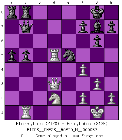 Last move : 0-1 2012 September 10 11:31:6 [Event "FICGS__CHESS__RAPID_M__000052"] [Site "FICGS"] [Date "2012.03.22"] [Round "1"] [White "Flores,Luis"] [Black "Fric,Lubos"] [Result "0-1"] [WhiteElo "2120"] [BlackElo "2125"] 1.d4 d5 2.Nf3 Nf6 3.Bf4 c5 4.e3 Nc6 5.c3 Qb6 6.Qb3 c4 7.Qc2 Bf5 8.Qc1 Nh5 9.b3 cxb3 10.axb3 Nxf4 11.exf4 Qxb3 12.Nbd2 Qb6 13.Nh4 Bd7 14.Bd3 g6 15.O-O Qc7 16.g3 Bg7 17.Qb2 O-O 18.Qb3 e6 19.Nhf3 a5 20.Rfb1 Rfb8 21.Bb5 Ne7 22.c4 Bxb5 23.Qxb5 b6 24.Ra4 dxc4 25.Rxc4 Qb7 26.Ne5 Nf5 27.Ra4 Nd6 28.Qd3 b5 29.d5 exd5 30.Rd4 Nc4 31.Rxd5 Nxe5 0-1 Queen's Bishop game Kingside Castling by player White (move 15) Kingside Castling by player Black (move 17) Player Black won this chess game. Follow this game move after move (download)Who is your opponent tonight, tonight I am playing against the Black pieces. (Akiba Rubinstein) Ich würde mich als ganz normalen Jungen bezeichnen [Im Alter von 12]. (Sergej Karjakin) El Peón aislado arroja penumbra sobre todo el tablero. (Aaron Nimzovich) Le jeu d'échecs fait naître et fortifie en nous plusieurs qualités précieuses dans le cours de l'existence, telles que la prévoyance, la circonspection, la prudence, et la persévérance. (Benjamin Franklin - 1783, la morale des échecs) Ah, beer! The cause of, and the solution to, all of life's problems. (Homer Simpson)