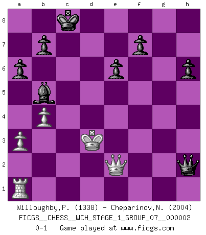 Last move : 0-1 2007 February 25 19:20:23 [Event "FICGS__CHESS__WCH_STAGE_1_GROUP_07__000002"] [Site "FICGS"] [Date "2007.01.16"] [Round "1"] [White "Willoughby,Peter"] [Black "Cheparinov,Nedelcho"] [Result "0-1"] [WhiteElo "1338"] [BlackElo "2004"] 1.e4 c5 2.Nf3 d6 3.Bb5+ Nc6 4.O-O Bd7 5.c3 Nf6 6.Re1 a6 7.Bxc6 Bxc6 8.d3 e6 9.Bg5 Be7 10.Nbd2 h6 11.Bxf6 Bxf6 12.e5 dxe5 13.Ne4 Qc7 14.Nxf6+ gxf6 15.b4 cxb4 16.cxb4 Qd6 17.a3 Rg8 18.g3 O-O-O 19.Re3 e4 20.Ne1 Qd5 21.f3 f5 22.fxe4 fxe4 23.Qe2 exd3 24.Rxd3 Qh1+ 25.Kf2 Qxh2+ 26.Ke3 Rxg3+ 27.Kd2 R8xd3+ 28.Nxd3 Rxd3+ 29.Kxd3 Bb5+ 0-1 Sicilian : Canal-Sokolsky (Nimzovich-Rossolimo, Moscow) attack Kingside Castling by player White (move 4) Queenside Castling by player Black (move 18) Player Black won this chess game. Follow this game move after move (download)Though most people love to look at the games of the great attacking masters, some of the most successful players in history have been the quiet positional players. They slowly grind you down by taking away your space, tying up your pieces, and leaving you with virtually nothing to do ! (Yasser Seirawan) Kein Schachspieler kann gut schlafen. (H. G. Wells) Cada Peón es una Reina en potencia. (James Mason) Le succès, c'est être capable d'aller d'échec en échec sans perdre son enthousiasme. (Winston Churchill) Difficult things take a long time, impossible things a little longer. (Author unknown)