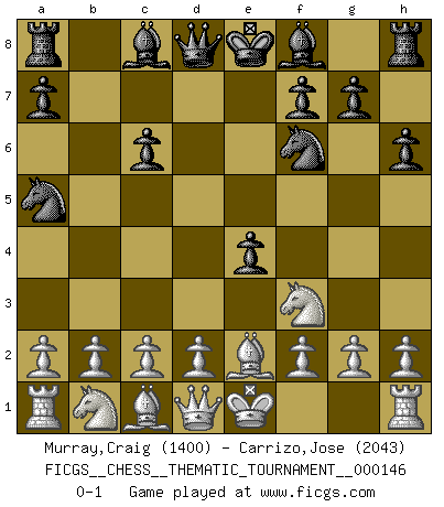 Last move : 0-1 2012 August 19 1:39:36 [Event "FICGS__CHESS__THEMATIC_TOURNAMENT__000146"] [Site "FICGS"] [Date "2012.03.22"] [Round "1"] [White "Murray,Craig"] [Black "Carrizo,Jose"] [Result "0-1"] [WhiteElo "1400"] [BlackElo "2043"] 1.e4 e5 2.Nf3 Nc6 3.Bc4 Nf6 4.Ng5 d5 5.exd5 Na5 6.Bb5+ c6 7.dxc6 bxc6 8.Be2 h6 9.Nf3 e4 0-1 This chess game has been lost on time (started : 2012.03.22 15:24:5) Two knights defense Player Black won this chess game. Follow this game move after move (download)The passion for playing Chess is one of the most unaccountable in the world. (H.G. Wells) Ich verlor meine Bürgerrechte, mein Gehalt wurde mir nicht mehr bezahlt und ich wurde zensiert und durfte nicht mehr ins Ausland reisen. [nach dem Match Fischer-Taimanov 6:0] (Mark Taimanov) Me gusta decir que Bobby Fischer fue el mejor jugador que jamás haya existido. Pero lo que hizo de Fischer un genio, fue su habilidad de mezclar una frescura y pragmatismo Americano con ideas Rusas acerca de la estrategia. (Bruce Pandolfini) Les Echecs ont trois composantes : le temps, l'espace et le matériel en dernier. (Mikhail Tal) If you work for a living, why do you kill yourself working ? (Tuco to a chicken in The Good, The Bad and The Ugly)