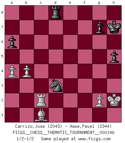 Last move : 1/2-1/2 2013 January 15 1:9:57 [Event "FICGS__CHESS__THEMATIC_TOURNAMENT__000146"] [Site "FICGS"] [Date "2012.03.22"] [Round "1"] [White "Carrizo,Jose"] [Black "Hase,Pavel"] [Result "1/2-1/2"] [WhiteElo "2043"] [BlackElo "2344"] 1.e4 e5 2.Nf3 Nc6 3.Bc4 Nf6 4.Ng5 d5 5.exd5 Nxd5 6.d4 Nxd4 7.c3 b5 8.Bd3 h6 9.Nxf7 Kxf7 10.cxd4 exd4 11.O-O Rb8 12.a4 Nb4 13.Bxb5 a6 14.Bc4+ Kg6 15.Nd2 Bd6 16.Ne4 Re8 17.Ng3 Kh7 18.Qxd4 Bxg3 19.Qxd8 Bxh2+ 20.Kxh2 Rxd8 21.Ra3 Bf5 22.Rc3 Bd3 23.Rd1 Bxc4 24.Rxd8 Rxd8 25.Rxc4 Nd3 26.Rxc7 Nxf2 27.b4 h5 28.Rc2 Nd3 1/2-1/2 Two knights defense : Lolli attack Kingside Castling by player White (move 11) This chess game ended in a draw. Follow this game move after move (download)Chess is a fighting game which is purely intellectual and includes chance. (Richard Reti) Ich rechne überhaupt nicht voraus. Ich gewinne auch so. (Robert James Fischer) El Ajedrez es un terrible juego. Si no controlas el centro, tu oponente tiene una posición mas holgada. Si tienes control del centro, ¡entonces realmente tu tienes algo de que preocuparte!. (Siegbert Tarrasch) Le système Elo représente seulement une moyenne. Il est simplement un indicateur de votre stabilité. (Anatoli Karpov) The ultimate in disposing one's troops is to be without ascertainable shape. Then the most penetrating spies cannot pry in nor can the wise lay plans against you. (Sun Tzu)