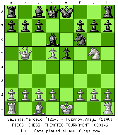 Last move : 1-0 2012 May 16 13:16:31 [Event "FICGS__CHESS__THEMATIC_TOURNAMENT__000146"] [Site "FICGS"] [Date "2012.03.22"] [Round "1"] [White "Salinas,Marcelo"] [Black "Puzanov,Vasyl"] [Result "1-0"] [WhiteElo "1254"] [BlackElo "2140"] 1.e4 e5 2.Nf3 Nc6 3.Bc4 Nf6 4.Ng5 d5 5.exd5 Na5 6.Na3 Bxa3 7.Qe2 Nxc4 8.Qxc4 Bd6 9.Qb5+ 1-0 This chess game has been lost on time (started : 2012.03.22 15:24:5) Two knights defense Player White won this chess game. Follow this game move after move (download)I play correspondence chess because it is both art and science while chess is art only. (A player at FICGS) Ich brauche nur einen Blick auf das Schachbrett zu werfen, und weiß schon, was in der Stellung steckt, was geschehen kann und was geschehen wird. Alle übrigen suchen und prüfen, ich aber weiß es! (José Raúl Capablanca) Mis oponentes también hacen buenas movidas. A veces yo no tomo esas cosas en consideración. (Bobby Fischer) Il vaut toujours mieux jouer un plan faux de façon logique que de n'avoir pas de plan du tout. (Victor Kortchnoï) There is a computer disease that anybody who works with computers knows about. It's a very serious disease and it interferes completely with the work. The trouble with computers is that you 'play' with them ! (Richard P. Feynman)