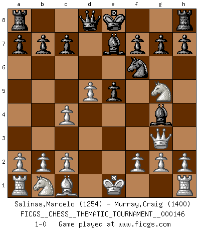 Last move : 1-0 2012 June 5 15:14:9 [Event "FICGS__CHESS__THEMATIC_TOURNAMENT__000146"] [Site "FICGS"] [Date "2012.03.22"] [Round "1"] [White "Salinas,Marcelo"] [Black "Murray,Craig"] [Result "1-0"] [WhiteElo "1254"] [BlackElo "1400"] 1.e4 e5 2.Nf3 Nc6 3.Bc4 Nf6 4.Ng5 d5 5.exd5 Na5 6.d3 Be7 7.Qf3 Nxc4 8.dxc4 Bg4 9.Qg3 1-0 This chess game has been lost on time (started : 2012.03.22 15:24:5) Two knights defense : Kieseritsky variation Player White won this chess game. Follow this game move after move (download)There are tough players and nice guys, and I'm a tough player. (Bobby Fischer) Das typische an einem Großmeister ist, daß er eine gewonnene Position schnell und schmerzlos gewinnt. (Irving Chernev) Coloca el contenido de las piezas del Ajedrez en un sombrero, agitalo vigorosamente, arrojalas en un tablero desde una altura de 30 centimetros y así obtendras el estilo de Steinitz. (H. E. Bird) On entre au jeu d'Echecs comme on entre en Religion. Pour le joueur d'Echecs, la partie d'Echecs c'est l'office, la messe, le défilé du 1er Mai, le dépôt de gerbe au Monument aux Morts. C'est un drame sacré. (Michel Roos) The problem with troubleshooting is that trouble shoots back. (Anonymous)