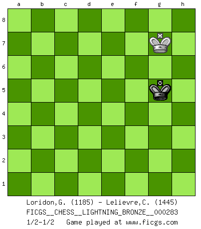 Last move : 1/2-1/2 2012 March 22 23:49:39 [Event "FICGS__CHESS__LIGHTNING_BRONZE__000283"] [Site "FICGS"] [Date "2012.03.22"] [Round "1"] [White "Loridon,Geoffroy"] [Black "Lelievre,Clement"] [Result "1/2-1/2"] [WhiteElo "1185"] [BlackElo "1445"] 1.d4 e5 2.dxe5 Nc6 3.Nf3 d5 4.Nc3 d4 5.Nb5 Bb4+ 6.c3 dxc3 7.bxc3 Qxd1+ 8.Kxd1 Bc5 9.Nxc7+ Ke7 10.Nxa8 Bb6 11.e3 Ba5 12.Ba3+ Ke6 13.Bc4+ Kf5 14.Nd4+ Ke4 15.Bb4 Bxb4 16.cxb4 Nxb4 17.Bxf7 Nh6 18.Bc4 Ng4 19.f3+ Kxe3 20.fxg4 Bxg4+ 21.Ke1 Kxd4 22.Be2 Bxe2 23.Rb1 Nxa2 24.Kxe2 Nc3+ 25.Kf2 Nxb1 26.Rxb1 Rxa8 27.Rxb7 Kxe5 28.Rxg7 a5 29.Rxh7 a4 30.Rh5+ Kd4 31.Rb5 a3 32.Rb1 a2 33.Ra1 Kc3 34.h4 Kb2 35.Rxa2+ Rxa2 36.h5 Ra4 37.Kf3 Rh4 38.g4 Kc3 39.Kg3 Rh1 40.Kf4 Kd4 41.Kf5 Rf1+ 42.Kg5 Ke5 43.h6 Rf6 44.h7 Rf8 45.Kg6 Rh8 46.g5 Kf4 47.Kh6 Rxh7+ 48.Kxh7 Kxg5 49.Kg7 1/2-1/2 Queen's pawn : Charlick (Englund) gambit 10 pieces endgame at move 27 : White KRPPP , Black KRPPP WHITE : King + 1 Rook 3 Pawns BLACK : King + 1 Rook 3 Pawns 9 pieces endgame at move 27 : White KRPP , Black KRPPP WHITE : King + 1 Rook 2 Pawns BLACK : King + 1 Rook 3 Pawns 8 pieces endgame at move 28 : White KRPP , Black KRPP WHITE : King + 1 Rook 2 Pawns BLACK : King + 1 Rook 2 Pawns 7 pieces endgame at move 29 : White KRPP , Black KRP WHITE : King + 1 Rook 2 Pawns BLACK : King + 1 Rook 1 Pawn 6 pieces endgame at move 35 : White KRPP , Black KR WHITE : King + 1 Rook 2 Pawns BLACK : King + 1 Rook 5 pieces endgame at move 35 : White KPP , Black KR WHITE : King + 2 Pawns BLACK : King + 1 Rook 4 pieces endgame at move 47 : White KP , Black KR WHITE : King + 1 Pawn BLACK : King + 1 Rook 3 pieces endgame at move 48 : White KP , Black K WHITE : King + 1 Pawn BLACK : King + 2 pieces endgame at move 48 : White K , Black K WHITE : King + BLACK : King + This chess game ended in a draw. Follow this game move after move (download)In a gambit you give up a Pawn for the sake of getting a lost game. (Samuel Standige Boden) Es ist wirklich schade, dass so viele Schachspieler nicht auf ihr Äußeres achten! (Alexandra Kosteniuk) ¿Quién es tu oponente esta tarde? Esta tarde mi oponente son las piezas negras. (Akiba Rubinstein) Des points faibles ou des trous dans la position de l'adversaire doivent être occupés par des pièces et non pas par des pions. (Siegbert Tarrasch) Work expands to fill the time available. (C. Northcote Parkinson, in Parkinson's Laws)